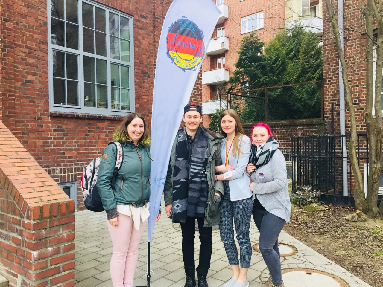Foto unten: rechts von der Fahne: Weronika Jacubowska und Laura Sophie Laudert mit Freunden aus der Berufsschule (links)