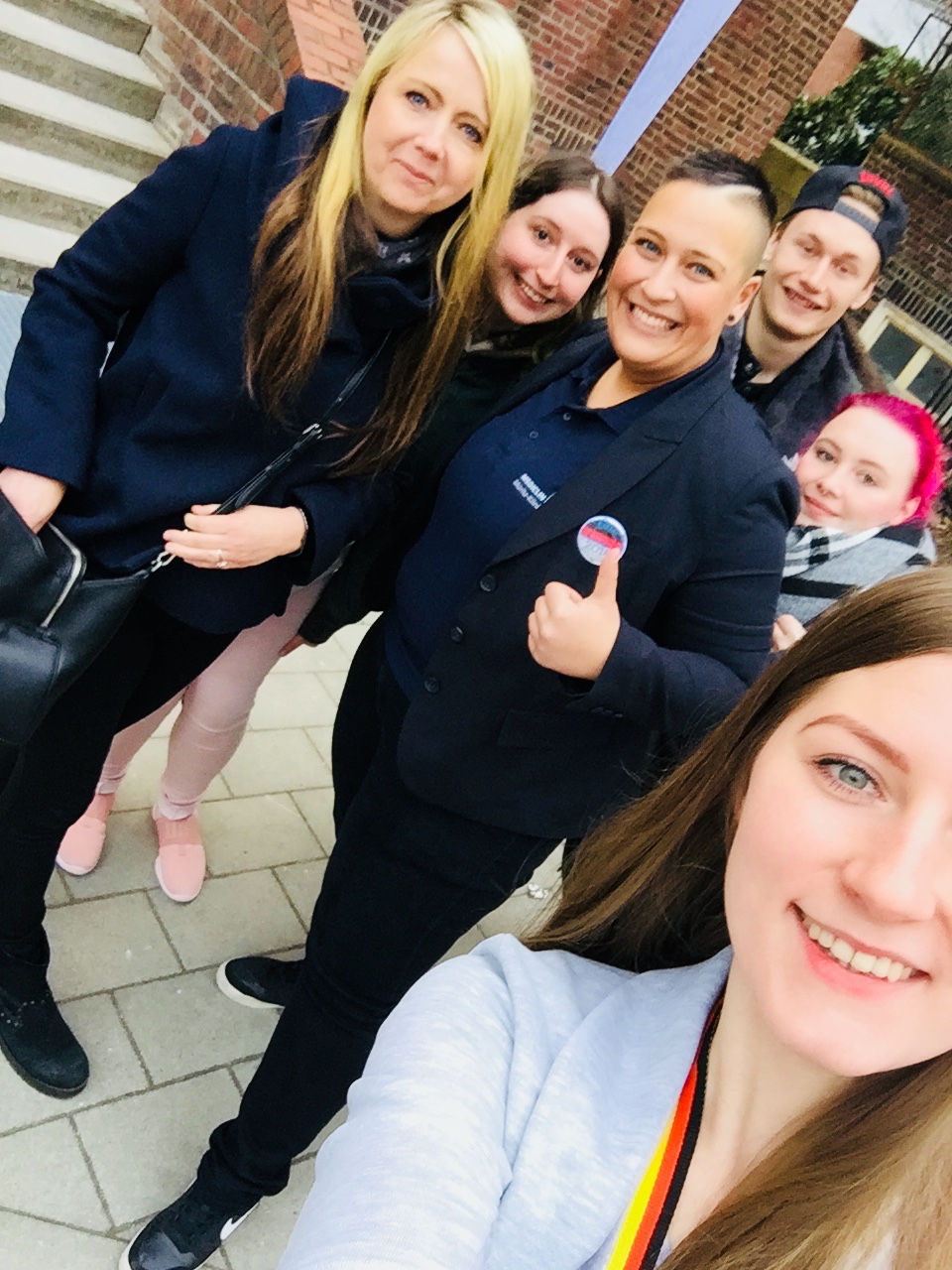 Foto unten: rechts von der Fahne: Weronika Jacubowska und Laura Sophie Laudert mit Freunden aus der Berufsschule (links)