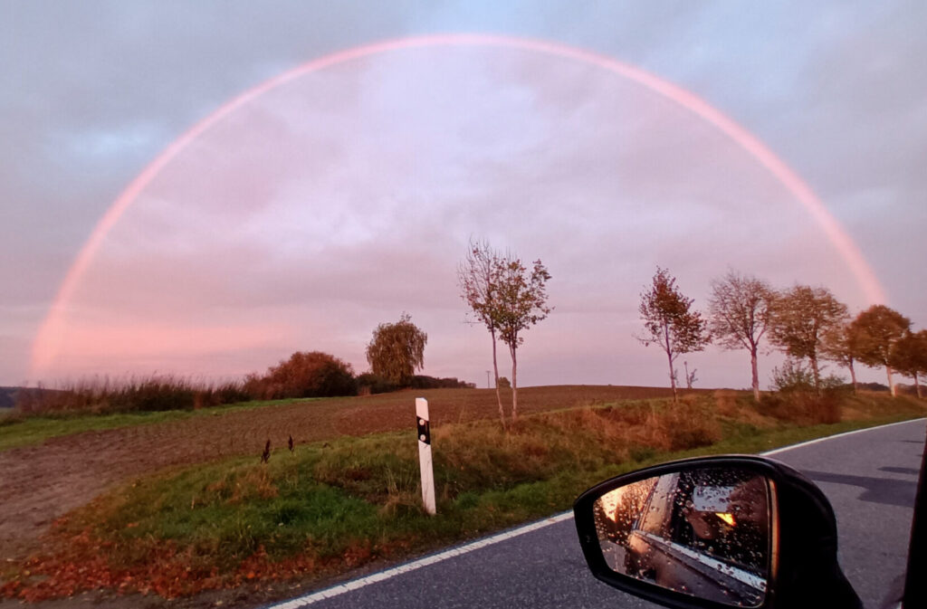 WeiterlesenEin wunderschöner Regenbogen, scheinbar angestrahlt von der Sonne. Ein Sonnenregenbogen? Aufgenommen heute 7:55 Uhr in Woldzegarten