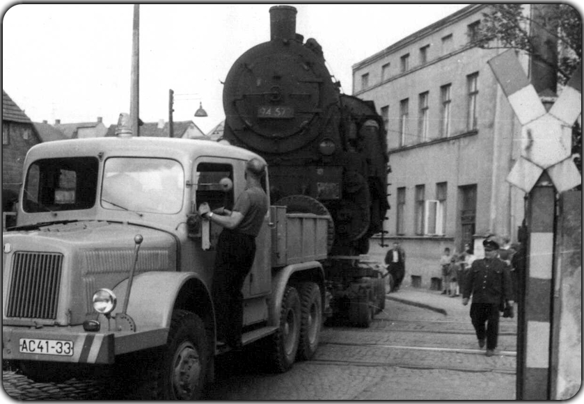 Es ist eine Güterzuglok 94.5-17, die auch steile Strecken bewältigte. Sie wurde bei der DR bis 1975 eingesetzt. Leider weiß ich nicht, wo überall aber sie war nicht selten. Sie wird auf dem Bild auf einem Culemeyer überführt. Entweder war sie nicht lauffähig oder es musste ein Abschnitt ohne Normalspurgleis überbrückt werden. Vielleicht kennt jemand den Straßenzug. Dann könnte man wahrscheinlich rekonstruieren, um welchen Einsatzbereich es sich gehandelt hat.