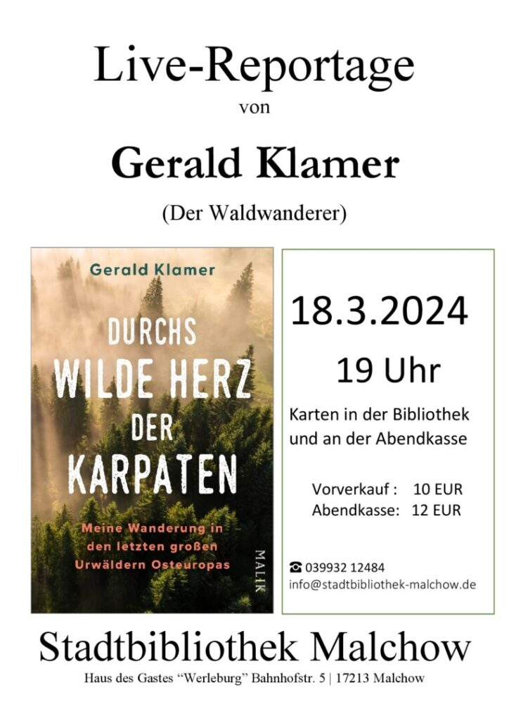 WeiterlesenVortrag von Gerald Klamer zum neuen Buch: „Durchs wilde Herz der Karpaten“ heißt ein Vortrag von Gerald Kramer am morgigen Montag, 18. März, ab 19 Uhr in der Stadtbibliothek Malchow.