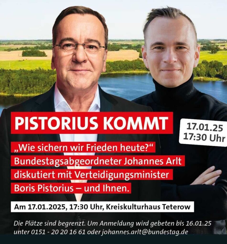 WeiterlesenWie sichern wir Frieden heute?“ Diese Frage steht im Fokus der Diskussionsveranstaltung, zu der der SPD-Bundestagsabgeordnete Johannes Arlt am 17. Januar um 17.30 Uhr nach Teterow ins Kreiskulturhaus einlädt. Mit