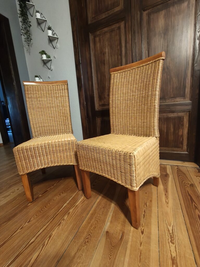 WeiterlesenIch biete zum Verkauf Esszimmerstühle 2 Stk. Braun Natur Rattan an. Guter Zustand. 44T x 45B x 106H cm Sitzhöhe vom Boden: 47 cm 100 EUR Abholung in Waren