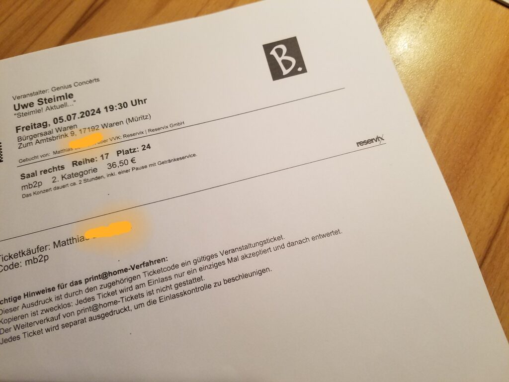 WeiterlesenWegen Krankheit ein Ticket für Uwe Steimle am 5.7. um 19.30 Uhr in Waren, Bürgersaal, abzugeben. VHB 36 €. Abholbar in Groß Plasten oder Übergabe in Waren möglich. Gruß, Matthias