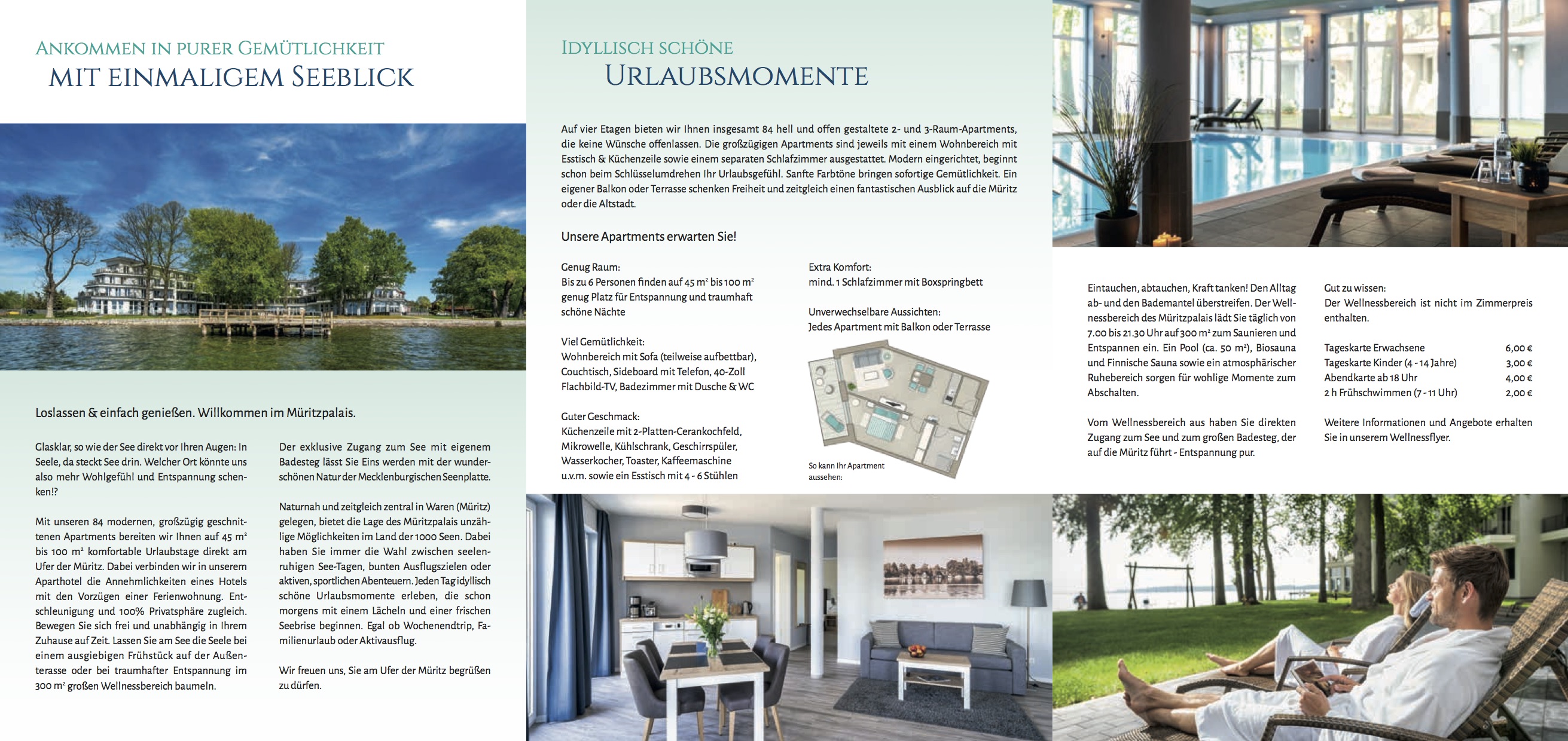 Das neu eröffnete Müritzpalais heißt seine Gäste mit 84 modernen, großzügig geschnittenen Apartments auf 45 bis 100 Quadratmetern herzlich willkommen und bereitet ihnen komfortable Urlaubstage direkt am Ufer der Müritz. Dabei verbindet das Müritzpalais die Annehmlichkeiten eines Hotels mit den Vorzügen einer Ferienwohnung. Entschleunigung und 100 Prozent Privatsphäre zugleich. Am See, bei einem ausgiebigen Frühstück auf der Außenterrasse oder bei traumhafter Entspannung im 300 Quadratmetern großen Wellnessbereich die Seele baumeln lassen: Entspannung pur!