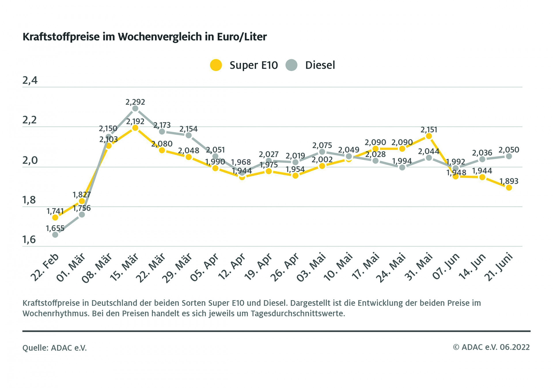 Während der Benzinpreis abschmilzt, ist Diesel erneut teurer geworden. Dies zeigt die wöchentliche ADAC Auswertung der Kraftstoffpreise in Deutschland. So kostet aktuell im bundesweiten Mittel ein Liter Super E10 1,893 Euro. Gegenüber der Vorwoche ist dies ein Minus von 5,1 Cent. Dieselfahrer müssen hingegen im Vergleich zur Vorwoche mehr für ihre Tankfüllung bezahlen. Der Preis für einen Liter Diesel liegt aktuell im Schnitt bei 2,050 Euro und damit 1,4 Cent mehr als vor einer Woche.